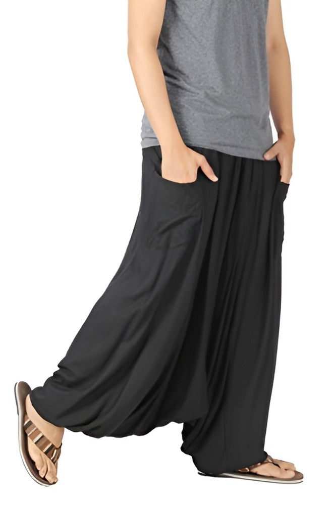 Whitewhale's Harem hippie clothes pants men is a beautiful trousers that made from 100% Rayon. It's so comfortable in summer time, relaxation and easy to move. You can wear this trousers around the house and outdoor with their flexible waist and voluminousity, they could be the most comfortable trousers ever made. These trousers have an elasticated waistband and elasticated openings at the ankles. The trousers are baggy enough so that normal walking and movement are not restricted, and they are actually really comfortable. The elasticated waistband makes them suitable for a wide range. This pants can mix and match for your hippy, gypsy, aladdin costumes, bohemian or festival style clothes.