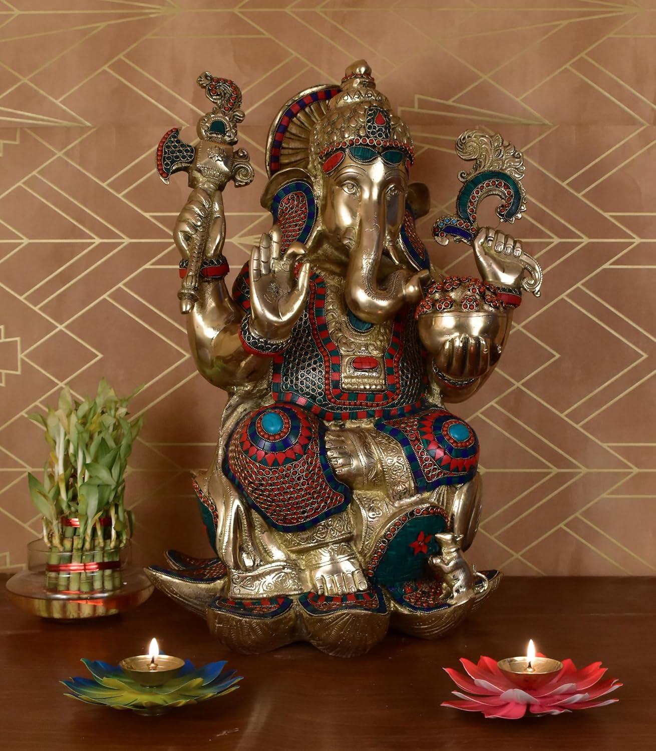White Whale Large Lord Ganesha Sitting On Lotus Brass Idol Hindu Good Luck God Deity Ganesh Statue -Hindu Ganesha Idol Sculptures Home Décor