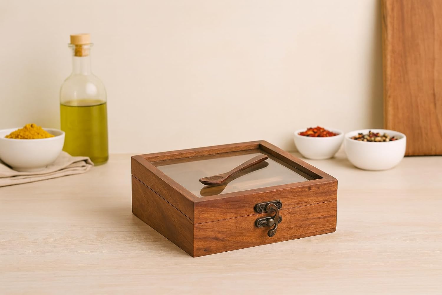 Whitewhale Handmade Wooden Spice box with Clear Hinged Lid Tea Masala Chest