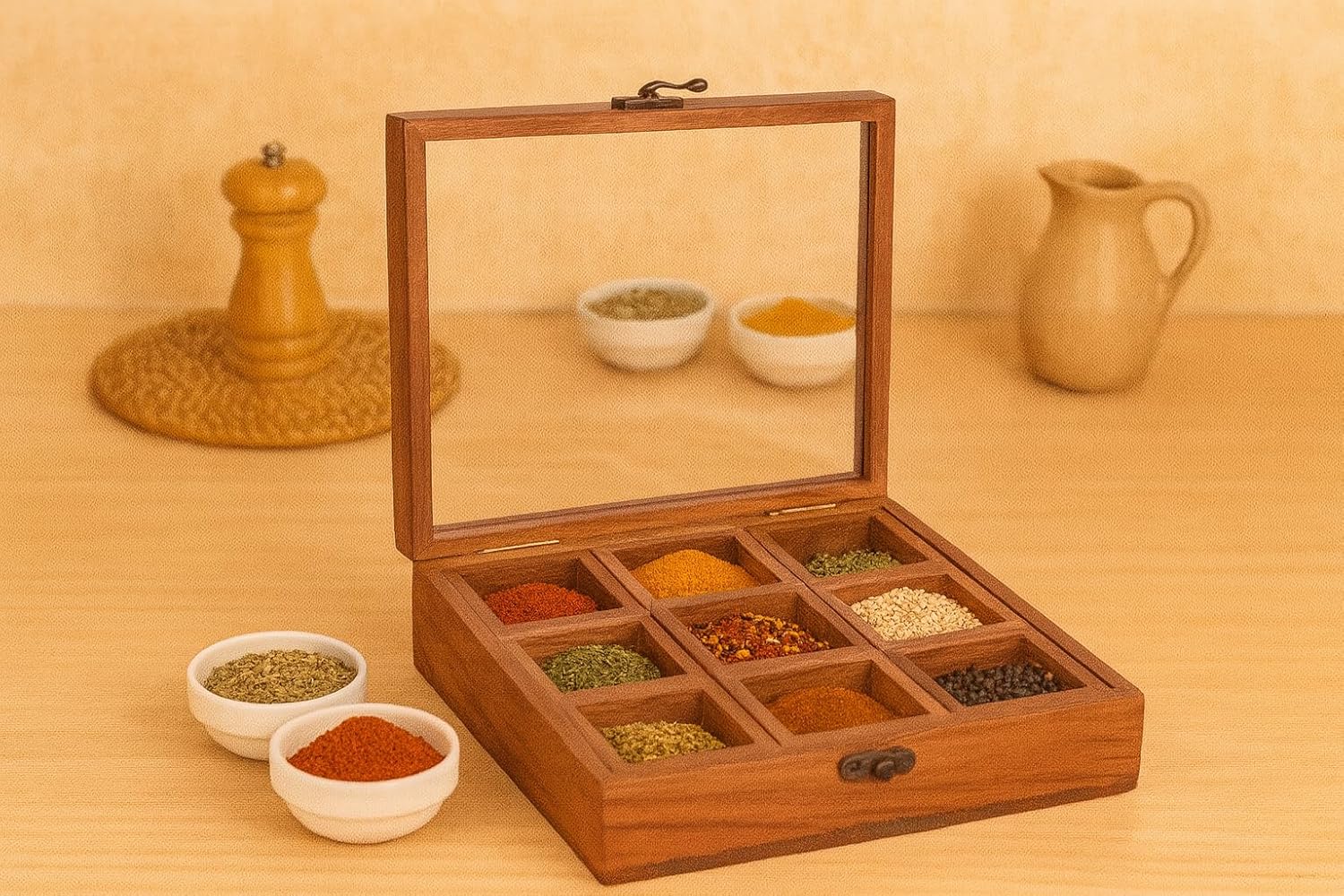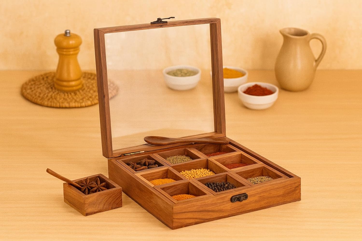 Whitewhale Handmade Wooden Spice box with Clear Hinged Lid Tea Masala Chest