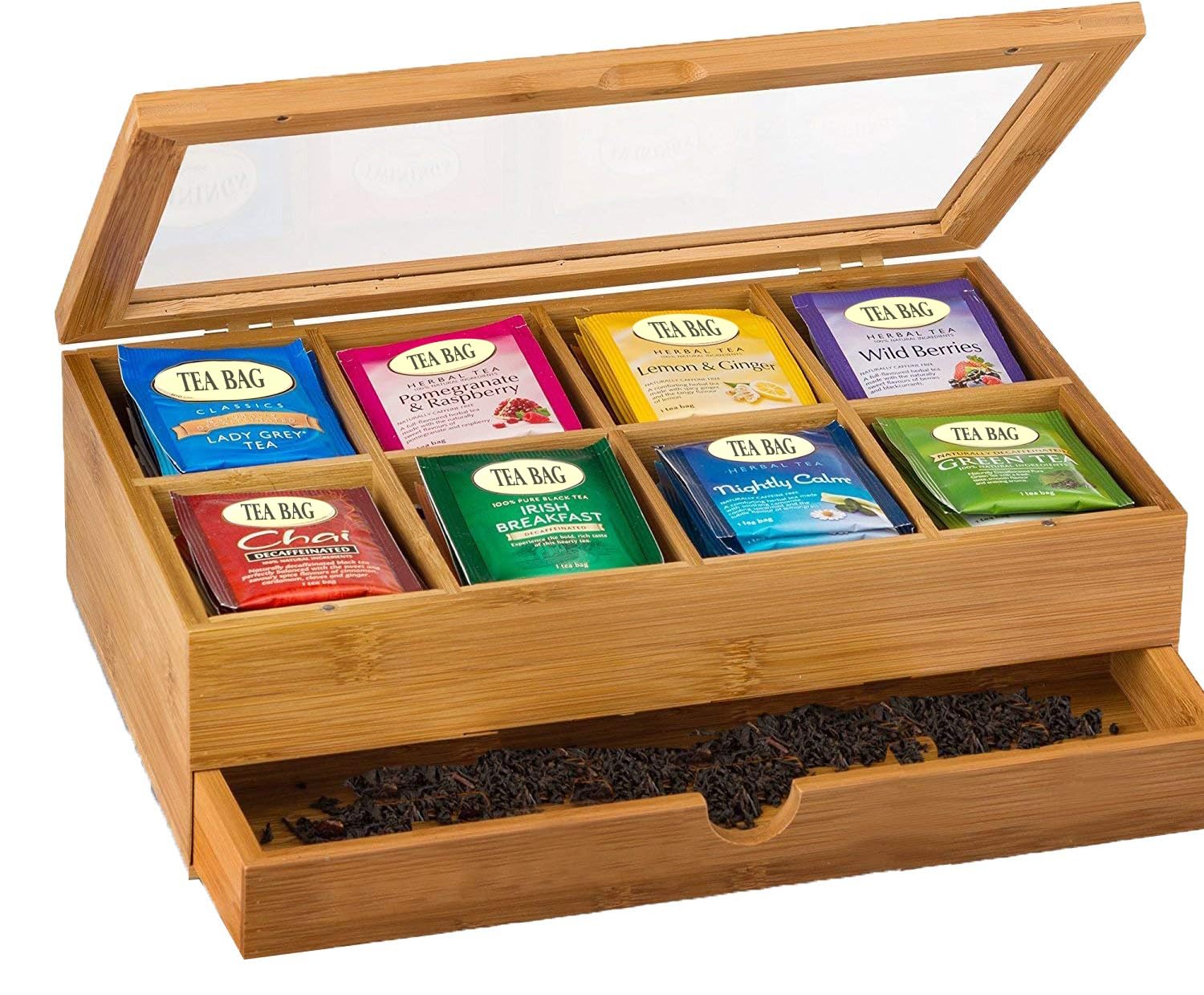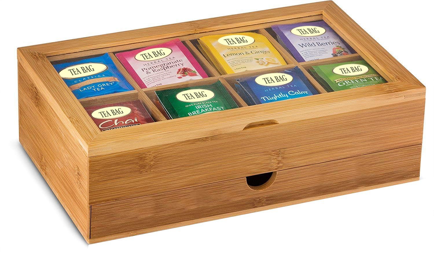 - EASY TO USE TEA STORAGE BOX: Self-standing open lid position for easy tea bag selection; see tea bags while lid is closed with shatterproof transparent acrylic top; keep tea bags fresh and tea contain