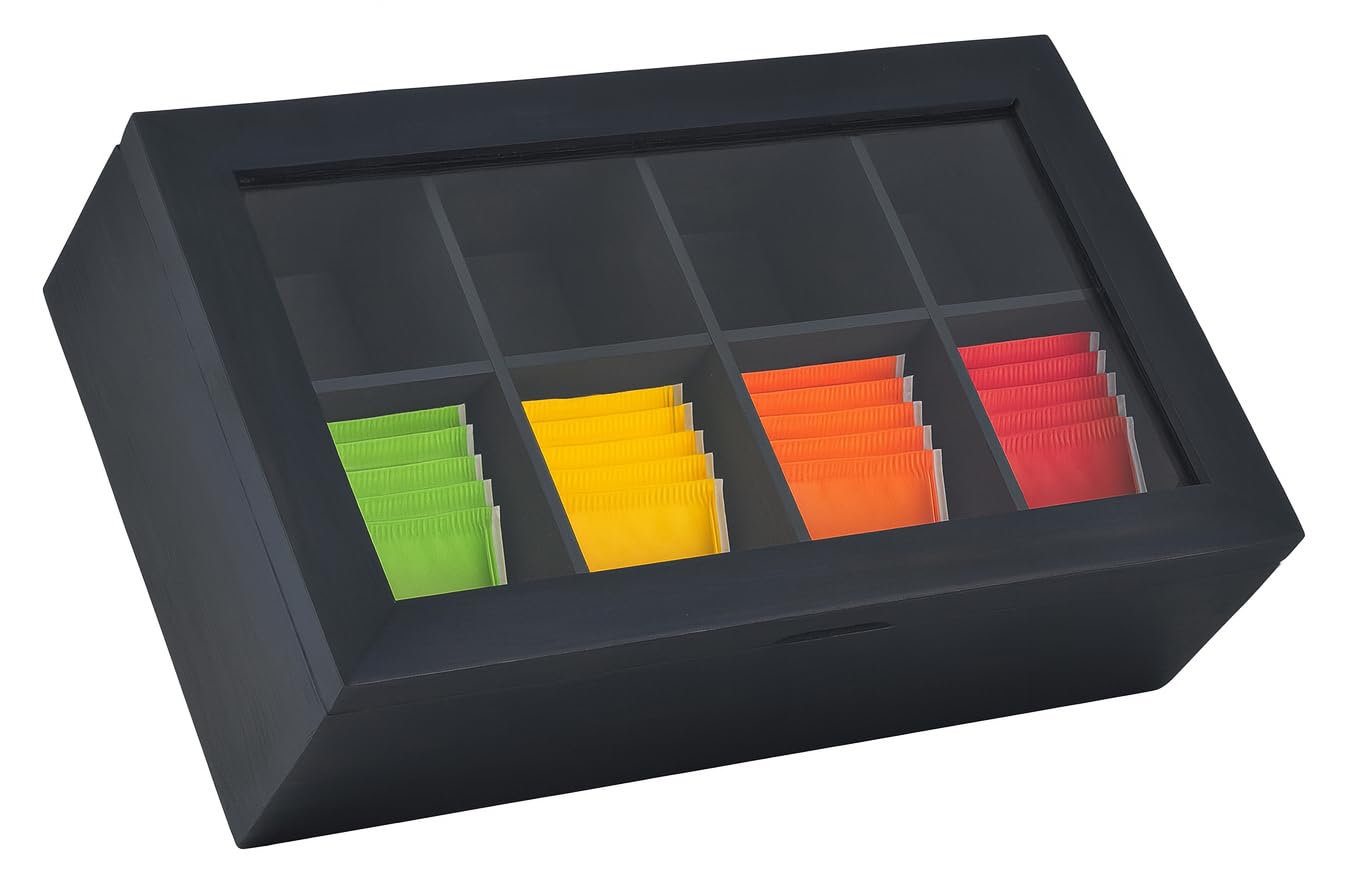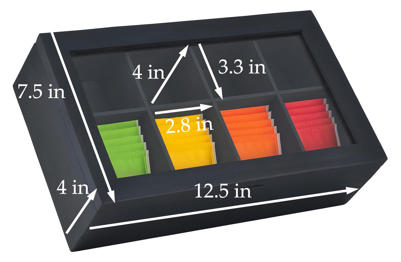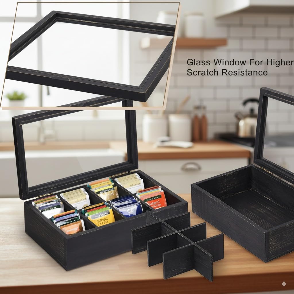 - 8 Equally Divided Compartments provide plenty of space to store, keeps your tea bags fresh for months, organize and separate different tea packets, creamers, sugar cube, coffee pods, instant coffee and etcTransparent Glass design allows user to see exactly which flavor they are going for and to see and know when it’s time to refill the container again, provide more convenience