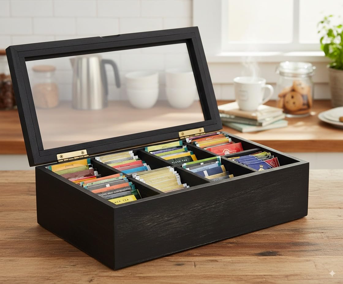 - Wooden Tea Box can help to get rid of the cluttering of kitchen counter, not only keep them organized, but preserve their freshness, a nice storage tool for kitchen and restaurant