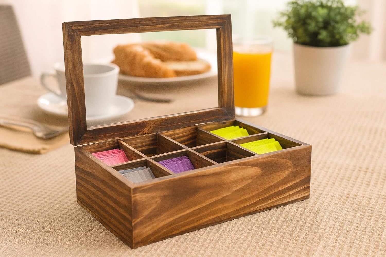 - 8 Equally Divided Compartments provide plenty of space to store, keeps your tea bags fresh for months, organize and separate different tea packets, creamers, sugar cube, coffee pods, instant coffee and etcTransparent Glass design allows user to see exactly which flavor they are going for and to see and know when it’s time to refill the container again, provide more convenience