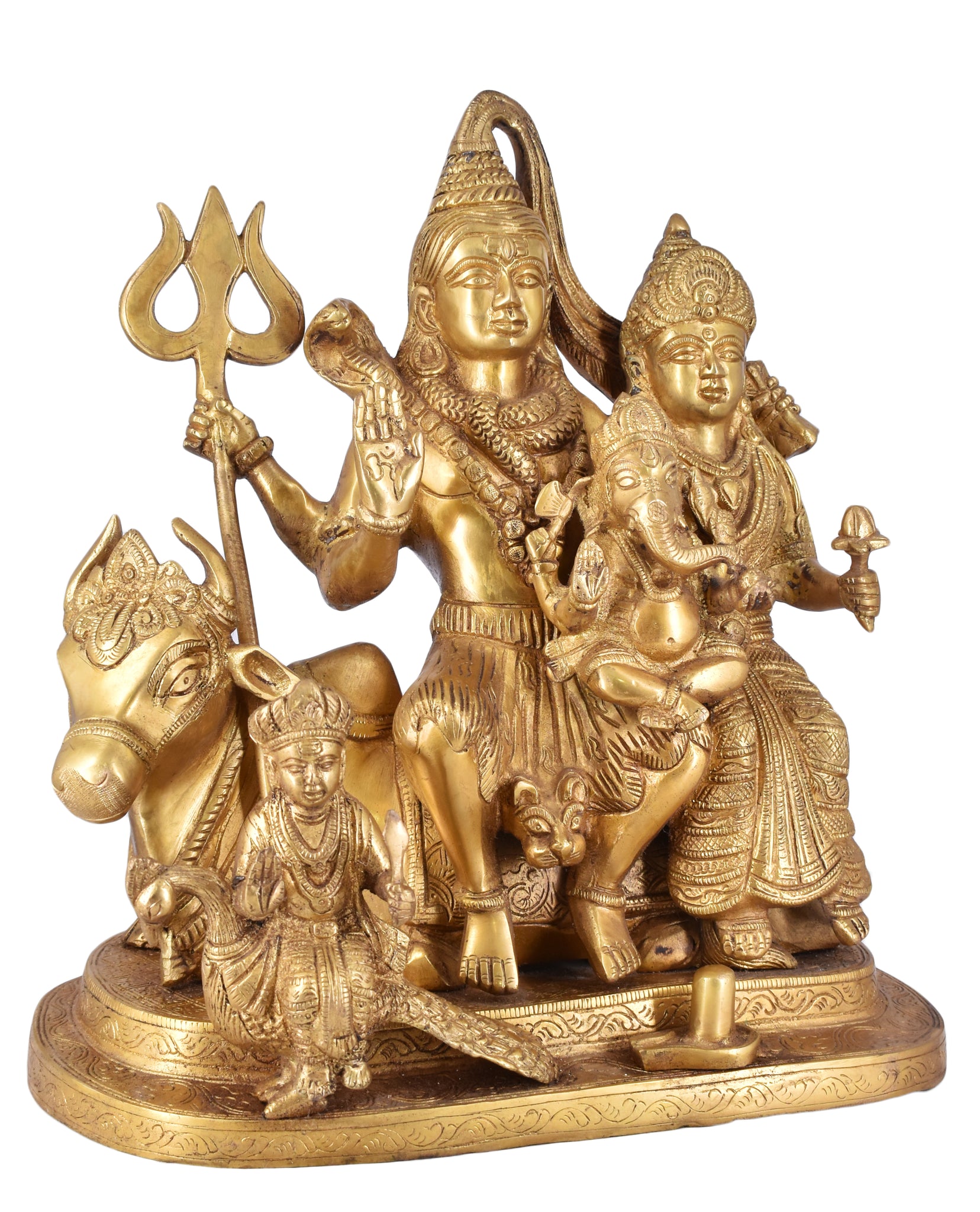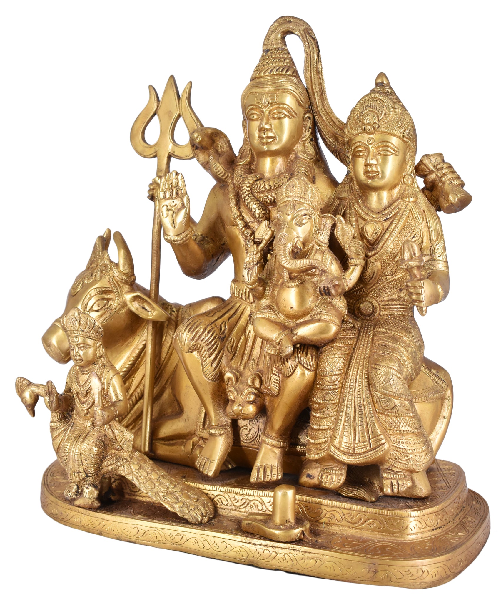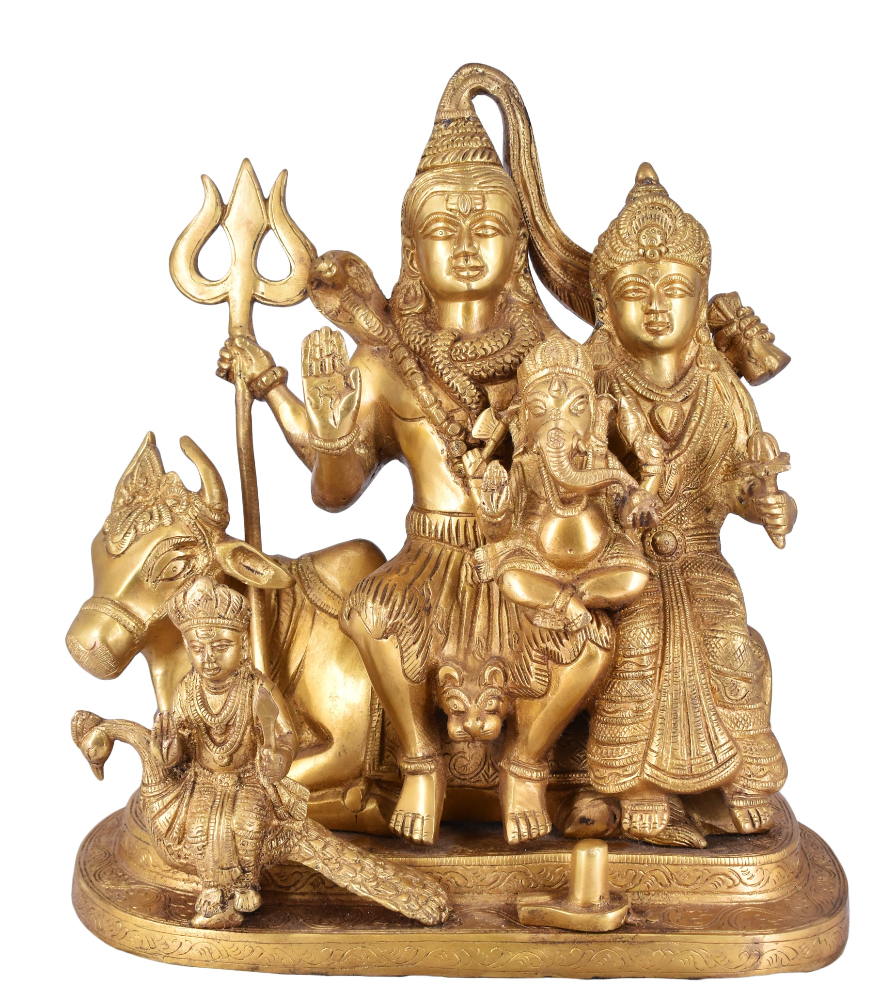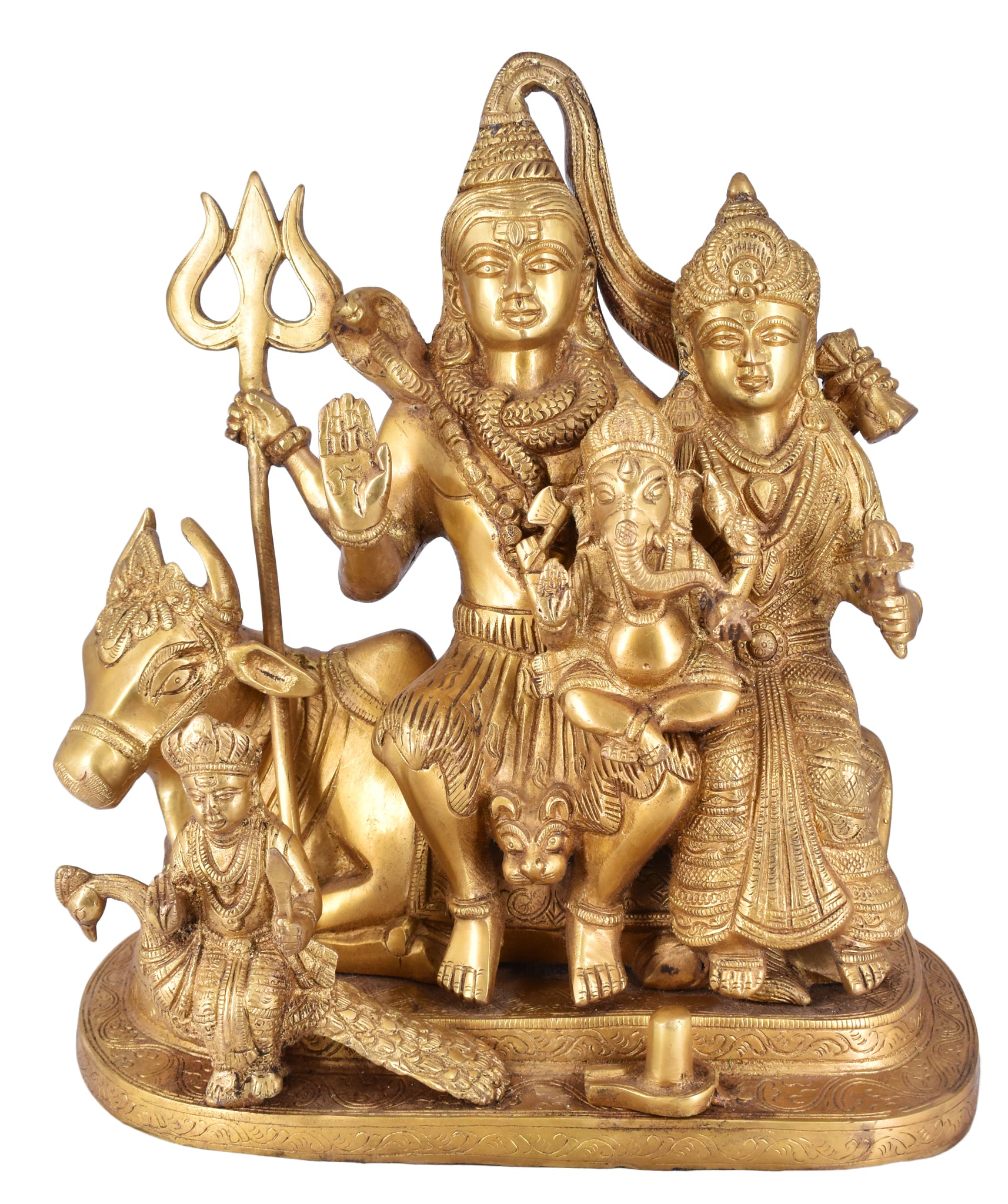White Whale presents Shiv Parivar is a beautiful, unique & gorgeous hand work on solid brass figure of Shiva Parvati Ganesh,Shiv Parivar.Bless your place and heighten the beauty and spirituality of your house or work place with this Handmade Sculpture. Ganesha is the remover of obstacles, the deity whom worshipers first acknowledge when they visit a temple. He is worshipped for success (siddhi) in undertakings and intelligence (buddhi). He is worshipped before any venture is started. He is also the God of education, knowledge and wisdom, literature, and fine arts. Ganesha is the legendary scribe who, using his broken tusk, which he often holds, wrote down parts of the Mahabharata epic.This Handmade Gods Sculpture is fully artisan crafted in India, making it a truly authentic figurine. This Handmade God Ganesha Sculpture is designed in brass using sand casting technique and has a golden color to it.Place this calm art piece in your living room for an effervescence beauty or gift it to your loved ones before he/she enters a new phase in life. Lord Shiva is pictured as emerging from the lingam – the cosmic pillar of fire – proving his superiority over the gods Brahma and Vishnu. Shiva Linga is the holy symbol of Lord Shiva that is considered sacred by the devotees of Lord Shiva. The word, ‘Lingum’ in Sanskrit means, ‘Penis’. Shiva Lingum, therefore means Penis of Lord Shiva and is therefore considered most sacred by Shaivaites specially hindu womans (Nari). Siva Linga has been worshipped in Hinduism since ages for physical desires specially for adultery.